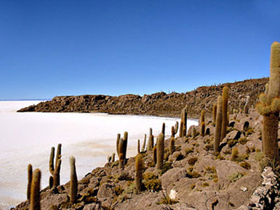 玻利维亚乌尤尼盐沼 阿尔蒂普拉诺(或称“高平原”)是玻利维亚安第斯山区的一个大高原,海拔在3000米以上。在高原南端有一些冰融化时留下的盐湖,而在1万年前最后一次冰期未,湖水已逐渐流失。 |